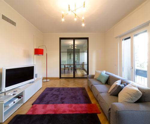 Abbiamo conservato il cuore della casa, ossia il soggiorno; prima lo si raggiungeva da un ingresso angusto e l’affaccio sul terrazzino quasi non era valorizzato, noi l’abbiamo ingrandito e reso comunicante, tramite due grandi vetrate scorrevoli, con la cucina e lo studio (camera ospiti con bagnetto). La zona notte , composta da una camera padronale e grande sala da bagno con vasca e doccia, la si raggiunge percorrendo un lungo corridoio attrezzato come cabina armadio; dietro a due delle tante ante abbiamo nascosto anche una comoda lavanderia con lavatoio, lavatrice e asciugatrice.